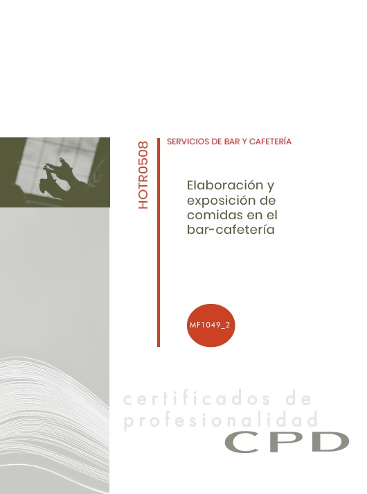 Desarrolla los contenidos del Módulo Formativo «Elaboración y exposición de comidas en el bar cafetería (MF1049_2)», (según el RD 1256/2009, de 24 de julio, modificado por el RD 685/2011, de 13 de mayo y por el RD 619/2013, 2 de agosto) , por el cual se establece el Certificado de Profesionalidad de Servicios de Bar y Cafetería, de la familia profesional de Hostelería y Turismo, que se incluye en el Catálogo Nacional de Cualificaciones Profesionales.